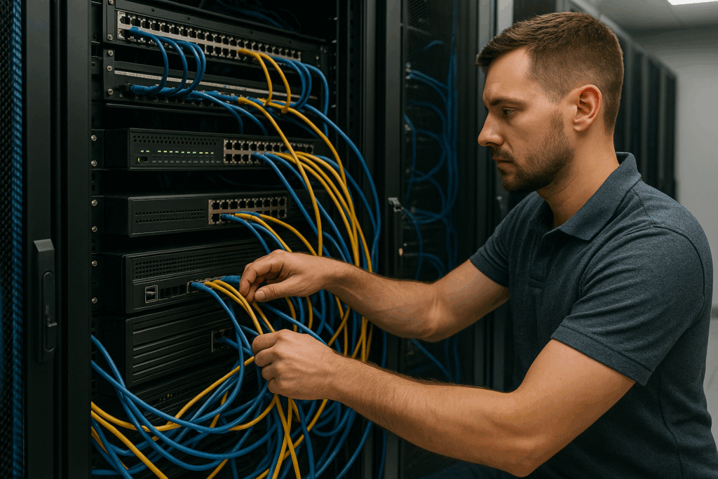 - ✔️ Instalace strukturované kabeláže (Cat5e, Cat6, optika)